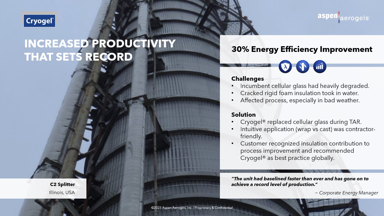 All the advanced aerogel properties of Cryogel allowed this customer’s C2 splitter to improve their process yield, reduced energy consumption by 30%, and allowed more consistent temperatures during inclement weather. Additionally, Cryogel proved to be contractor friendly as the cryogenic insulation was easier and quicker to install (wrap vs cast).